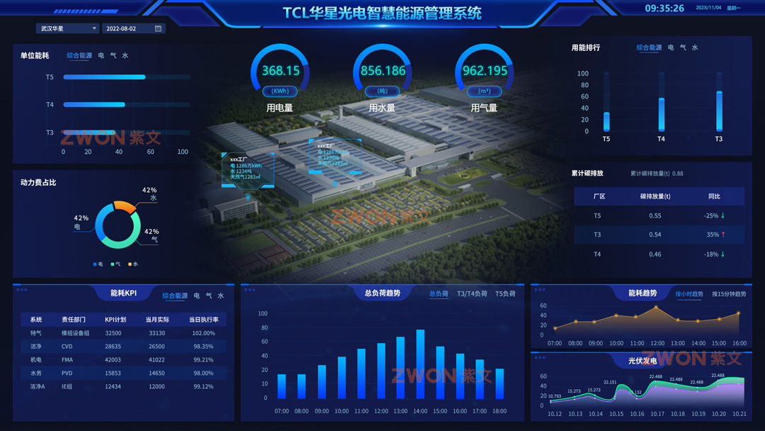 紫文科技参与TCL华星制造工厂智慧能源管理全过程设计。实现能源管理供应端到使用端的全流程追溯、制程及动力设备的能耗监控和预警、AI用能预测模型、动力费单价核算和KPI考核体系建设、数字化碳资产管理。能源管理项目从能效管理、人效提升、流程优化、数据管控精准度等各个方面提升平台智能化、数字化水平,配合智能制造共同打造灯塔工厂,共计20万系统设备点位数据采集,实现智慧能源的降本增效。